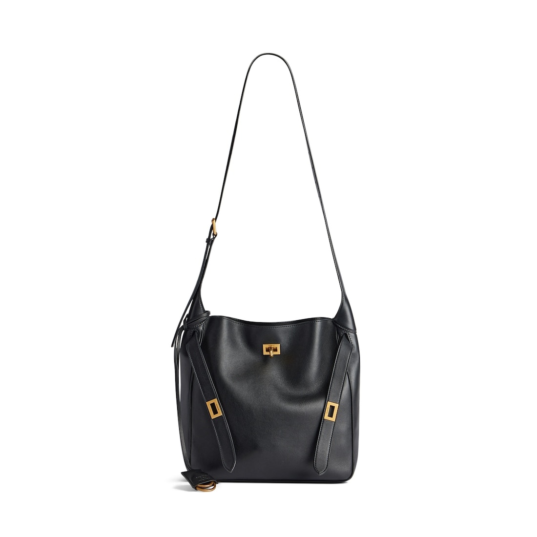 Bel Air Small Hobo Bag in black smooth calfskin, aged-gold hardware PRODUCT DETAILS • Dimensions: L10,2 x H10,6 x W3,9 inch • Smooth calfskin • Hobo • Adjustable shoulder strap (drop: 17,7 inch) • Shoulder carry • Aged-gold hardware • Removable leather key holder with two split rings • Turn lock closure and belts • Logo engraved on the closure system • 1 main compartment • 1 inner zipped pocket • Nappa lambskin bonded lining • Made in Italy Material: calfskin