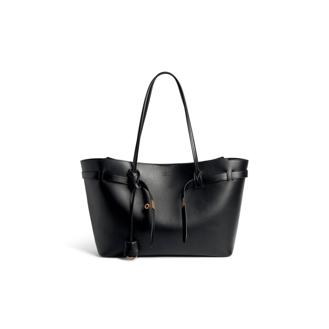 Bel Air Tote Bag Large in black smooth calfskin, aged-gold hardware PRODUCT DETAILS • Smooth calfskin • Tote bag • Two handles • Shoulder and hand carry • Balenciaga logo debossed at front • Removable cloche cles with one slit ring • Belt with turn lock closure at front with Balenciaga logo engraved • Aged-gold hardware • Snapped closure • 1 main compartment • 1 inner zipped pocket • Suede-like fabric lining • 4 brass feet • Made in Italy Material: calfskin
