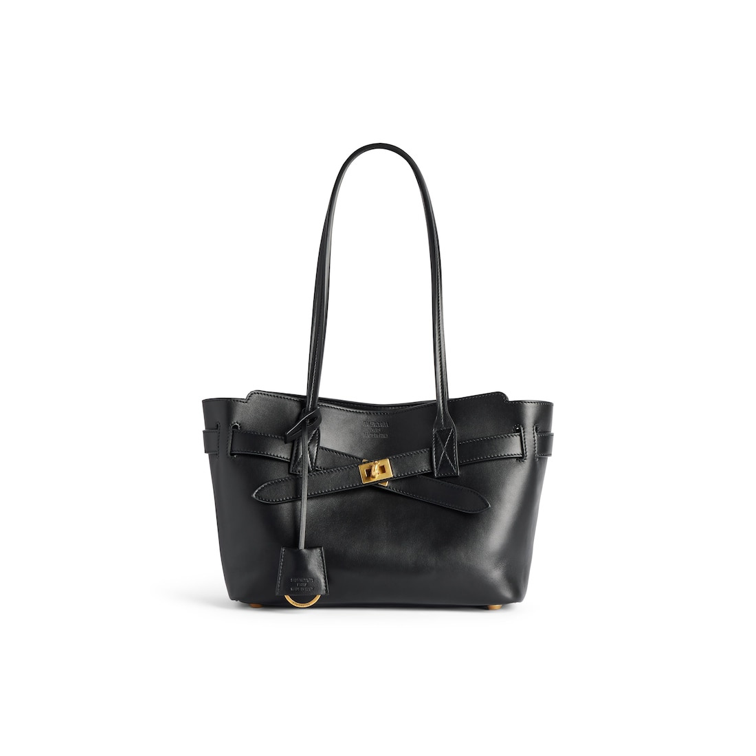 Bel Air Tote Bag Small in black smooth calfskin, aged-gold hardware PRODUCT DETAILS • Dimensions: L11,8 x H7,8 x W3,9 inch • Smooth calfskin • Tote bag • Two handles (drop: 9,8 inch) • Shoulder and hand carry • Balenciaga logo debossed at front • Removable cloche cles with one slit ring • Belt with turn lock closure at front with Balenciaga logo engraved • Aged-gold hardware • Snapped closure • 1 main compartment • 1 inner zipped pocket • Suede-like fabric lining • 4 brass feet • Made in Italy Material: calfskin