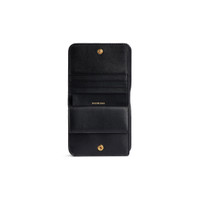Cash 2.0 Flap Coin And Card Holder in black smooth calfskin PRODUCT DETAILS • Dimensions: L3,9 x H3,5 x W0,9 inch • Smooth calfskin • Flap coin and card holder • Rounded edges • Balenciaga logo debossed at front • Shiny gold hardware • Snapped closure • 1 bill pocket • 4 card slots • 1 snapped coin purse • Made in Italy Material: calfskin