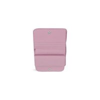 Cash Flap Coin And Card Holder in light pink and white grained calfskin PRODUCT DETAILS • Dimensions : L3,9 x H3,5 x W0,9 inch • Grained calfskin • Flap coin and card holder • Rounded edges • Balenciaga logo printed at front • Silver semi-shiny hardware • Snapped closure • 1 bill pocket • 4 card slots • 1 snapped coin purse • Made in Italy • Wipe with a soft cloth Material: 100% calfskin