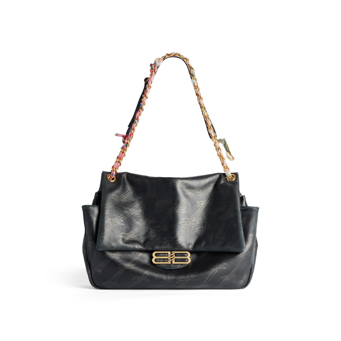 Darling Chain Bag Medium in black BB monogram printed buttery calfskin, aged-gold hardware PRODUCT DETAILS • Dimensions: L16,5 x H10,2 x W3,9 inch • BB monogram printed buttery calfskin • Chain bag • Sliding chain strap with ribbon (drop: 18,9 inch) • Crossbody and shoulder carry • Aged-gold BB icon logo at front • Curved flap • Studded magnet closure • 1 front pocket under flap • 1 main compartment • 1 inner zipped pocket • 2 flat pockets at back • Moire lining • Made in Italy Material: calfskin, viscose, silk