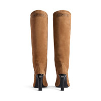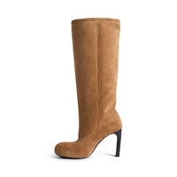 Fargo 100mm Boot in brown split calfskin and synthetic material PRODUCT DETAILS • Split calfskin, wool and synthetic material • Boot • Round toe • 100mm arch • Metal BB logo on the back of the heel • Balenciaga logo debossed at back • Tone-on-tone sole • Made in Italy Upper: calfskin, wool, polyester, acrylic - Sole: calfskin - Insole: calfskin