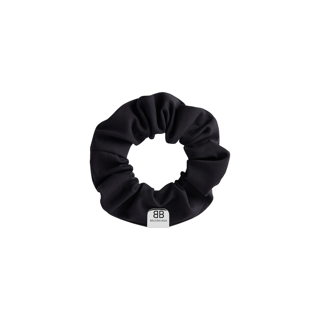 Holli S Scrunchie in black upcycled polyamide, elastane and antique silver brass PRODUCT DETAILS • Dimensions: L3,9 x H3,9 x W0,3 inch • Upcycled polyamide, elastane and brass • Scrunchie • BB Balenciaga logo engraved on metal clip • Can be worn as a scrunchie or bracelet • Made in Italy • Dry cleaning Material: 70% polyamide, 20% elastane, 10% brass