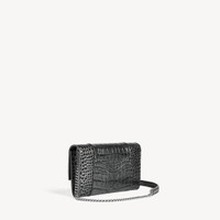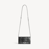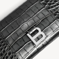 Hourglass Wallet On Chain in gun metal metallized soft crocodile embossed calfskin, aged-silver hardware PRODUCT DETAILS • Dimensions: L7,6 x H4,7 x W1,9 inch • Metallized soft crocodile embossed calfskin • Curvilinear shape • Wallet on chain • Adjustable chain strap (20,4 inch) • Studded magnet closure • Aged-silver B logo hardware • Nappa lambskin lining • Made in Italy Material: calfskin