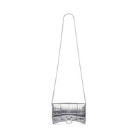 Hourglass Wallet On Chain in silver shiny crocodile embossed leather, aged-silver hardware PRODUCT DETAILS • Dimensions : L7,6 x H4,7 x W1,9 inch • Metallized crocodile embossed calfskin • Curvilinear shape • Wallet on chain • Adjustable chain strap (52 cm) • Studded magnet closure • B logo silver hardware • 1 patch pocket • 1 inner zipped pocket • 6 inner card slots • Nappa lambskin lining • Made in Italy • Wipe with a soft cloth Material: 100% Calfskin