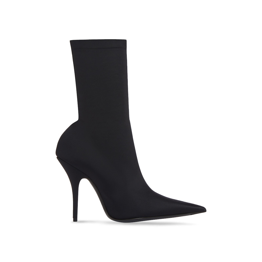 Knife 110mm Bootie in black matte spandex PRODUCT DETAILS • Matte spandex • Bootie • Elongated pointed toe • 110mm arch • Tone-on-tone covered heel • Black outsole • Made in Italy • Wipe with a soft cloth Material: 78% polyamide, 22% elastane