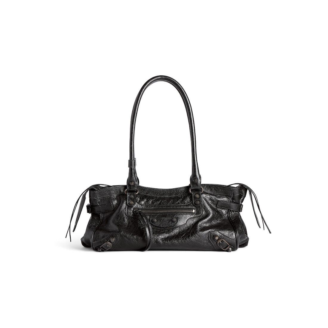 Le City Bag East West in black Arena Storico lambskin, brass hardware PRODUCT DETAILS • Dimensions: L15,7 x H7 x W5,9 inch • Arena Storico lambskin • Two handles with one handle clip (drop: 9,8 inch) • Shoulder carry • Brass hardware • Zipped closure with knotted leather puller • Front zipped pocket with knotted leather puller • 1 main compartment • 1 inner flat pocket • Cotton canvas lining • Made Italy Material: lambskin