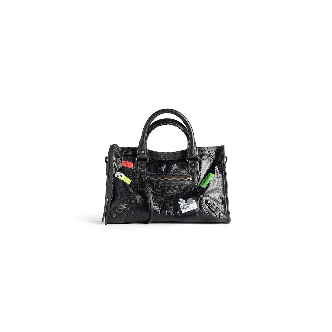 Le City Bag Small in black Arena Storico lambskin with printed stickers, brass hardware PRODUCT DETAILS • Dimensions: L11,8 x H7,5 x W3,9 inch • Arena Storico lambskin with printed stickers • Two leather hand-braided handles • Removable and adjustable shoulder strap (drop: 19,7 inch) • Brass hardware • Zipped closure with knotted leather puller • Front zipped pocket with knotted leather puller • 1 inner zipped pocket • Cotton canvas lining • Made in Italy Material: lambskin, calfskin