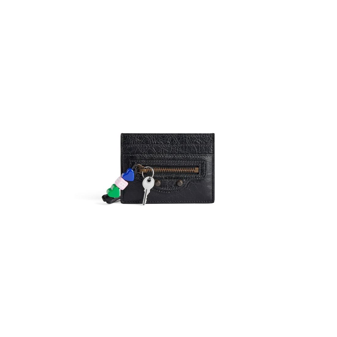 Le City Card Holder in black Arena Storico lambskin with charms PRODUCT DETAILS • Dimensions: L3,9 x H3,1 x W0,2 inch • Arena Storico lambskin with charms • Card holder • Balenciaga logo debossed tone-on-tone at back • Brass hardware • Front zipped pocket • 4 card slots • 1 bill pocket • Made in Italy Material: lambskin, brass, resin