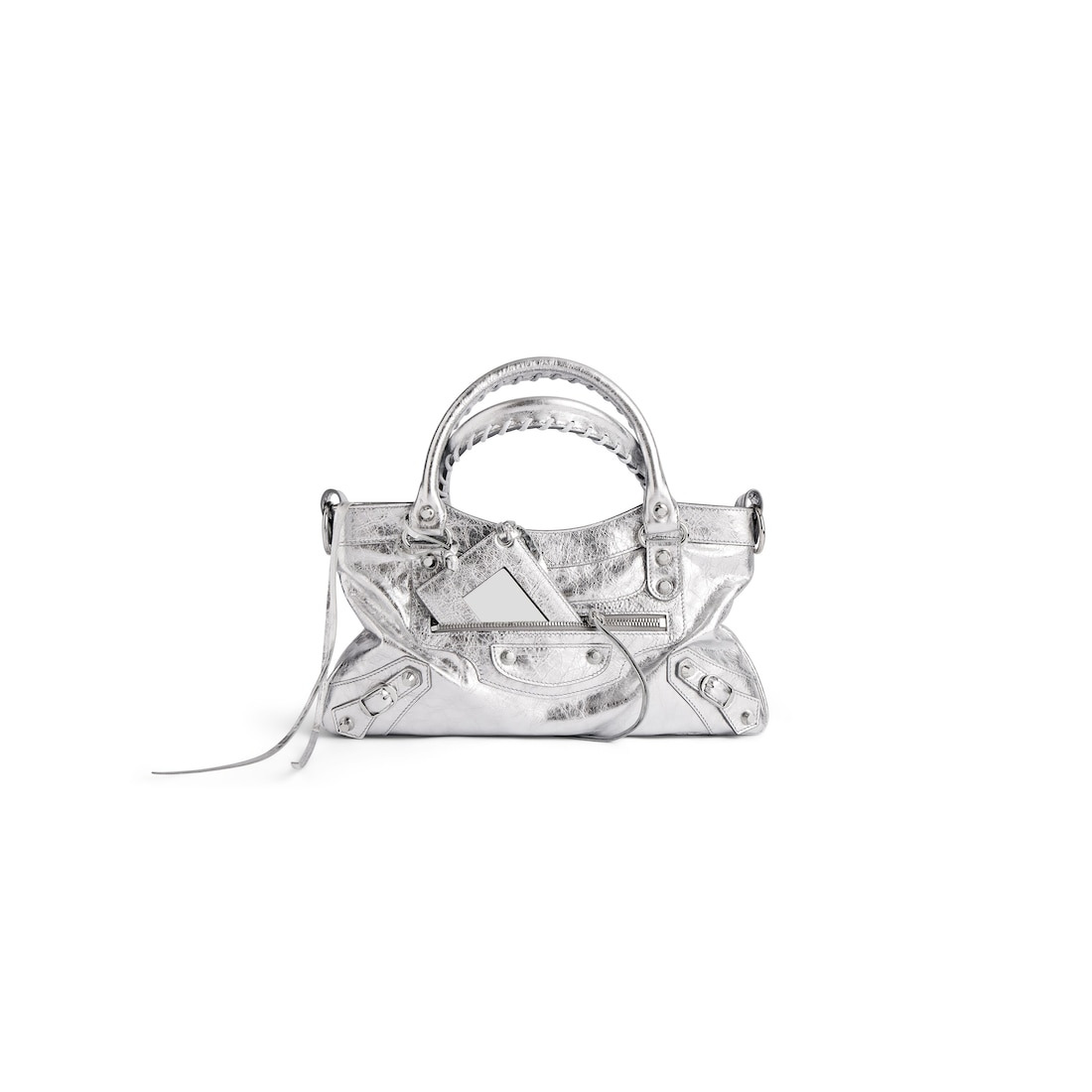 Le City First Bag in silver metallized Arena lambskin, shiny silver hardware PRODUCT DETAILS • Dimensions: L13,1 x H7,8 x W2,5 inch • Metallized Arena lambskin • Two hand-braided handles • Removable and adjustable strap with shoulder pad (drop: 9,8 inch) • Shoulder and hand carry • Shiny silver hardware • Zipped closure with knotted leather puller • Front zipped pocket with knotted leather puller • 1 main compartment • 1 inner zipped pocket • 1 removable mirror • Balenciaga blind-embossed on the back of the mirror • Cotton canvas lining • Made in Italy Material: lambskin