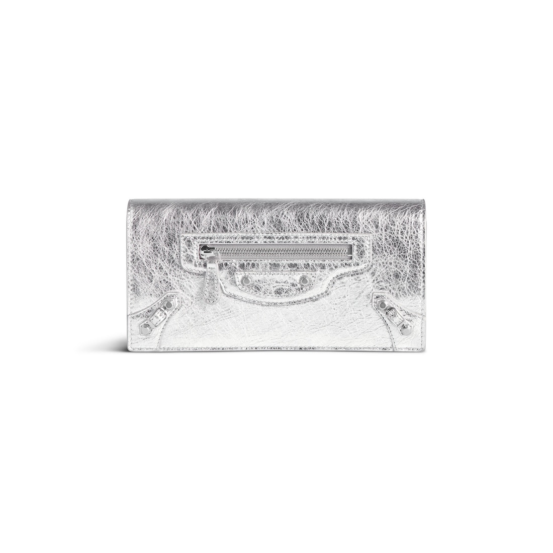 Le City Money Long Wallet in silver metallized Arena lambskin PRODUCT DETAILS • Dimensions: L7,4 x H3,9 x W0,7 inch • Metallized Arena lambskin • Long Wallet • Balenciaga logo debossed tone-on-tone at back • Shiny silver hardware • Snapped flap closure • 1 inner zipped coin pouch • 1 inner bill pocket • 12 card slots • Made in Italy Material: lambskin