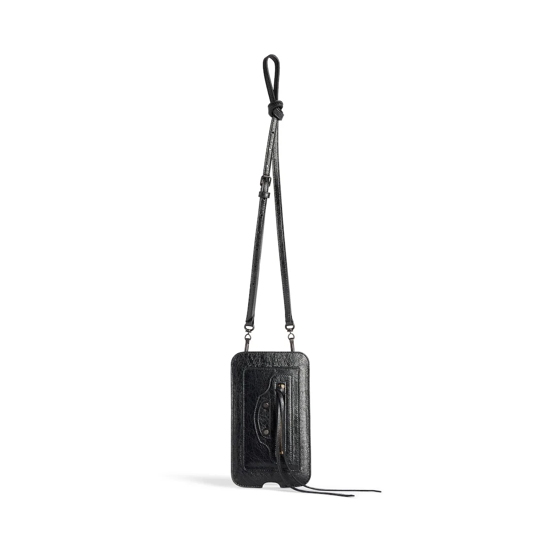 Le City Vertical Phone Holder in black Arena Storico lambskin PRODUCT DETAILS • Dimensions: L4,3 x H7,5 x W0,4 inch • Arena Storico lambskin • Phone holder • Adjustable and removable crossbody strap (drop: 20,8 inch) • Balenciaga logo debossed tone-on-tone at back • Brass hardware • Front zipped pocket with knotted leather puller • 1 main compartment • 3 card slots at back • Made in Italy Material: lambskin