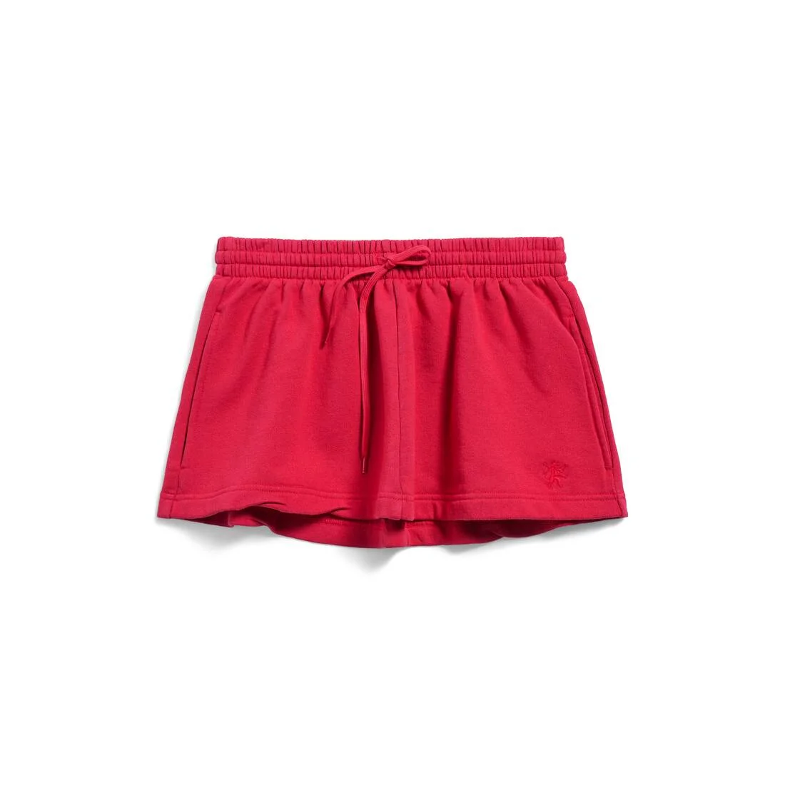 Lion Football Shorts Mini Skirt in red dry fleece is from look 33 of Balenciaga's Spring 26 Collection. PRODUCT DETAILS • Dry jersey • Mini skirt • Mid-waist • Football shorts inspired • Elasticated waistband with drawstring • 2 slash pockets • Tone-on-tone lion artwork embroidered on left hem • Made in Portugal Main material: 100% cotton