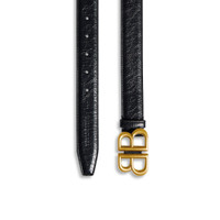 Monaco Belt in black Arena calfskin, aged-gold hardware PRODUCT DETAILS • Dimensions: Width: 1,2 inch • Arena calfskin • Balenciaga logo embossed tone-on-tone at end tip • Aged-gold BB logo hardware • 20 notches on the belt • Tone-on-tone leather loop • Made in Italy • Wipe with a soft cloth Material: 100% calfskin