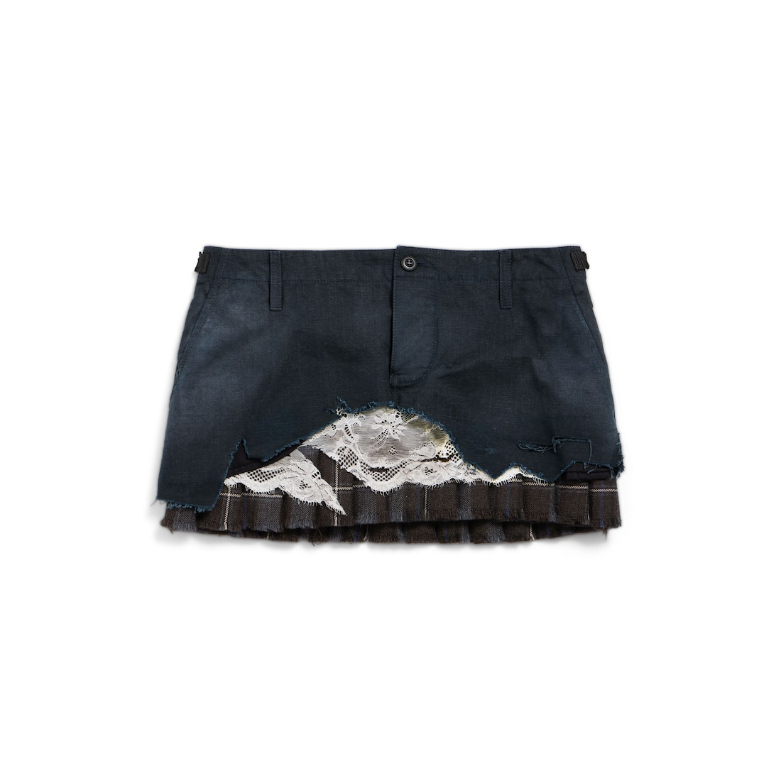 Patched Cargo Skirt in multicolor blend fabric for Women PRODUCT DETAILS • Cotton ripstop, lace ans checked wool • Layered construction, ripped effect • Mid-waist • Covered zip fly • 5 large belt loops • 2 belt tabs on sides to adjust waistline • 2 slash pockets at front • 2 flap pockets at back • Raw hem • Made in Italy Main material: 100% cotton