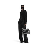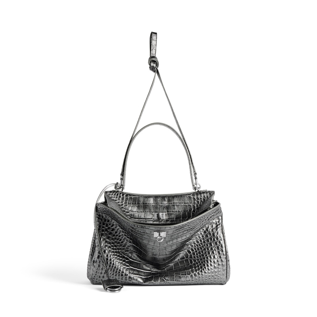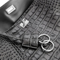 Rodeo Handbag Medium in gunmetal metallized crocodile embossed calfskin, aged-silver hardware PRODUCT DETAILS • Dimensions: L13,8 x H9,2 x W4,3 inch • Metallized crocodile embossed calfskin • Handbag • One handle (drop: 8,1 inch) • Removable shoulder strap (drop: 22,6 inch) • Removable cloche cles with two split rings • Aged-silver hardware • Turn lock closure • Wide front pocket • 1 main compartment • 1 inner zipped pocket • 2 flat pockets at back • Side snaps • 4 brass feet • Nappa lambskin lining • Made in Italy Material: calfskin