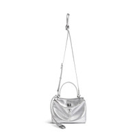 Rodeo Handbag Mini in silver shiny python embossed calfskin, aged-silver hardware PRODUCT DETAILS • Dimensions: L9 x H6,7 x W3,9 inch • Shiny python embossed calfskin • Handbag • One handle hand carry (drop: 4,7 inch) • Removable crossbody strap (drop: 27,2 inch) • Removable cloche cles with two split rings • Aged-silver hardware • Turn lock closure • Wide front pocket • 1 main compartment • 2 flat pockets at back • Side snaps • 4 brass feet • Nappa lambskin lining • Made in Italy Material: calfskin