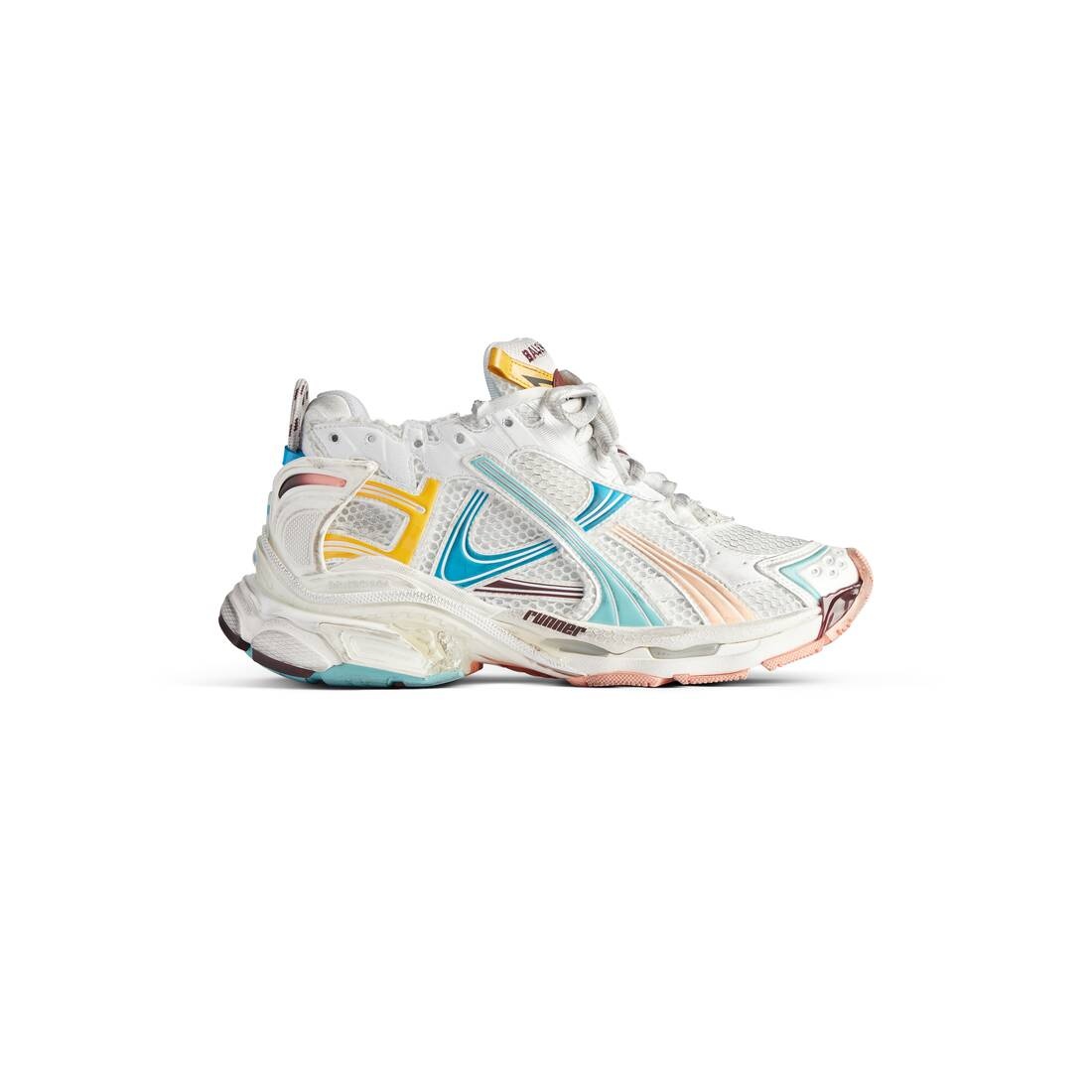 Runner Sneaker in white, yellow, pink and blue mesh and nylon PRODUCT DETAILS • Leather free • Sneaker • Mesh and nylon • Worn-out effect • Printed size at the edge of the toe • Debossed size at back • Runner logo printed on exterior • Balenciaga logo embroidered on the tongue • Balenciaga logo at the back of the heel • Back pull-on tab • Made in China Material: polyurethane, polyester