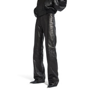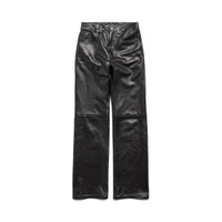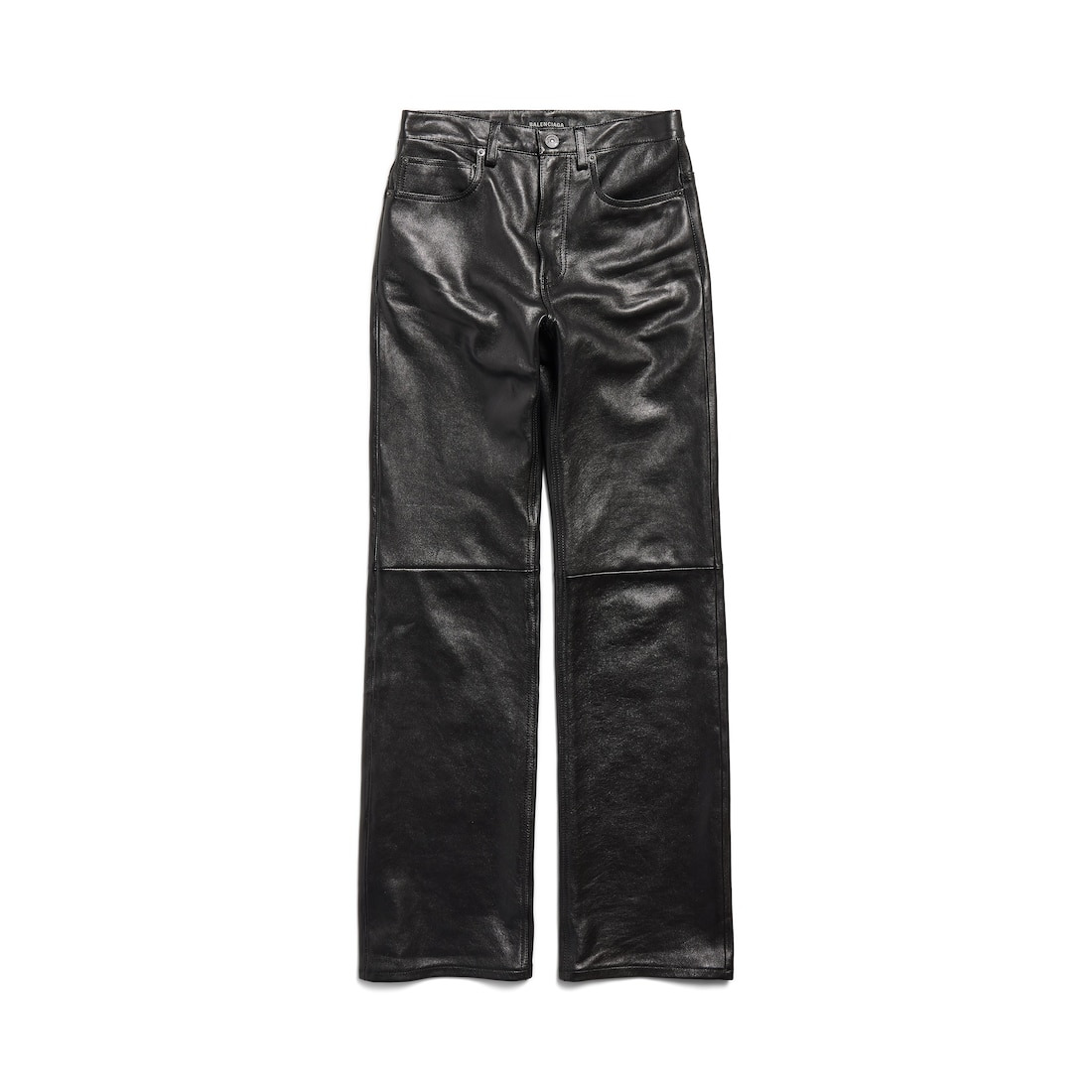 Straight Fit Pants in black semi shiny grainy leather for Women PRODUCT DETAILS • Semi-shiny grained calfskin • Mid-waist • Covered button fly • 5 belt loops • 5 pockets • Balenciaga engraved flex buttons • Made in Italy Main material: Lambskin