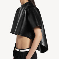 Train Cropped T-Shirt in black double shiny lambskin PRODUCT DETAILS • Double shiny lambskin • Cropped design • Train with a longer, rounded back • Volume at the back for added structure • Crewneck • Wide short sleeves • Debossed Balenciaga logo on the left sleeve • Made in Italy Main material: Lambskin