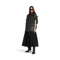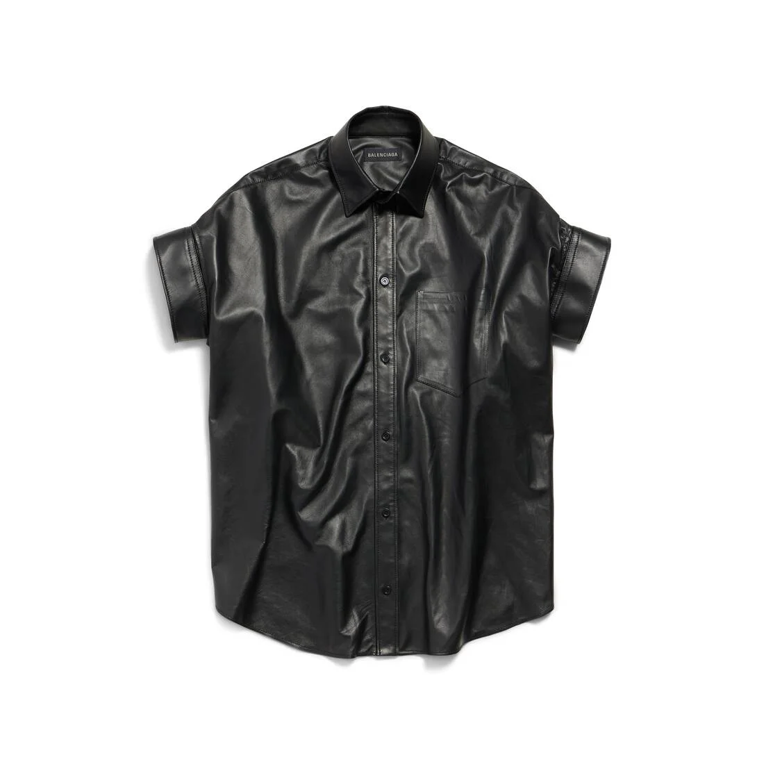 Tucked Sleeves Shirt in black shiny smooth lambskin PRODUCT DETAILS • Shiny smooth lambskin • Shirt collar • 6 button front • 1 patch pocket at chest • Short sleeves tucked inside effect • Rounded hem • Made in Turkey Main material: Lambskin