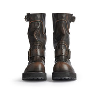 Venom Boot in brown calfskin PRODUCT DETAILS • Calfskin • Boot • Extra round toe • 20 mm arch • Worn-out effect • Adjustable straps with belt buckles • Balenciaga and 10 AV George V 75008 Paris logo debossed on the upper • Plate with Balenciaga logo engraved on exterior outsole • Thick toothed rubber outsole • Made in Italy Upper: calfskin - Sole: micro, TPU, calfskin, zamak - Insole: calfskin