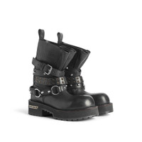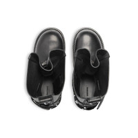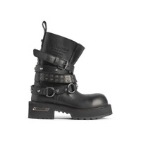Venom City Bootie in black worn-out calfskin PRODUCT DETAILS • Calfskin • Boot • Extra round toe • 20mm arch • Worn-out effect • Adjustable straps with belt buckles and aged-silver studs • Balenciaga and 10 AV George V 75008 Paris logo debossed on the upper • Plate with Balenciaga logo engraved on exterior outsole • Thick toothed rubber outsole • Loop at back • Made in Italy Upper: calfskin - Sole: micro, TPU, calfskin, zamak - Insole: calfskin