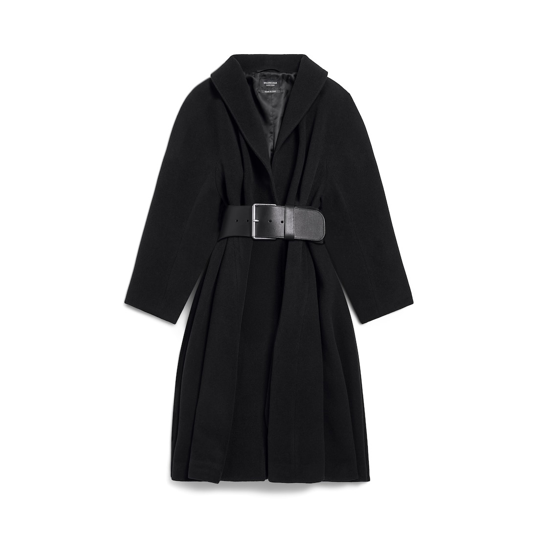 Wrap Coat in black brushed felted wool for Women is from look 72 of Balenciaga Winter 25 Collection. PRODUCT DETAILS • Felted wool and polyamide • Shawl collar • Wrap-around construction • Long kimono sleeves • Belt closure • Tone-on-tone belt • 2 belt loops at side • 2 slash pockets • Made in Italy Main material: 70% wool, 30% polyamide