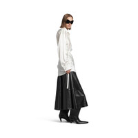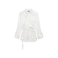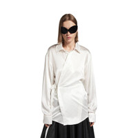 Wrap Shirt in ivory advanced biotech silk satin PRODUCT DETAILS • Advanced biotech silk satin • Asymmetric construction • Shirt collar • 7 button front • Long sleeves • Strassed buttoned cuffs • Rounded hem • Balenciaga engraved buttons • Balenciaga logo embroidered tone-on-tone on right cuff • Made in Italy Main material: 65% silk, 35% protein fiber