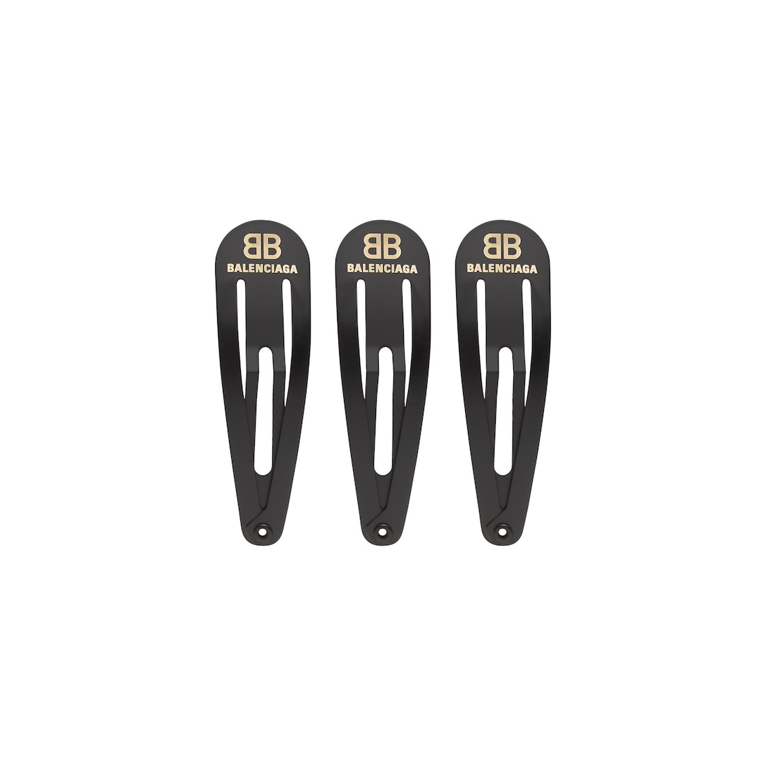 XXL XS Clip set of 3 in matte black & shiny gold steel PRODUCT DETAILS • Dimensions: L2,7 x H0,7 x W0,04 inch • Steel • Clip • Gold BB Balenciaga logo • Set of 3 • Made in Italy • Wipe with a soft cloth Material: 100% steel