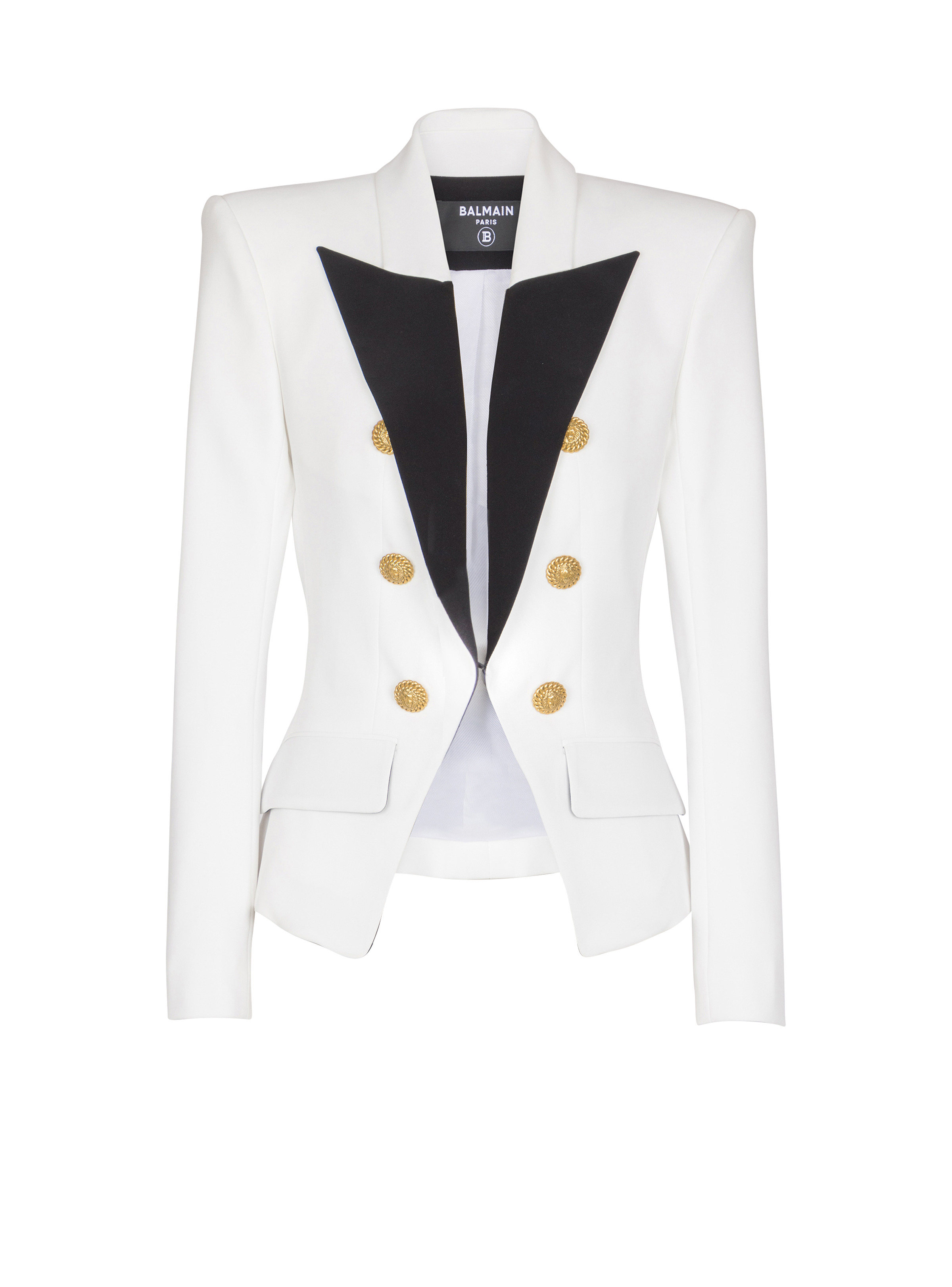 6-button two-tone jacket - Italian tailored collar with large contrasting lapels - Structured shoulders - Long sleeves - Straight cuffs with 5 buttons - 6 decorative buttons - “Bobine” two-tone metal buttons - 2 side slash pockets with flaps - Twill lining - Fitted with marked waist - Model measures 179cm and wears a size 36 - Main material: 97% viscose 3% elastane - Made in Bulgaria - Item: EF2SM340MH73100% of the viscose fibres used to make this garment come from certified, sustainably managed forests