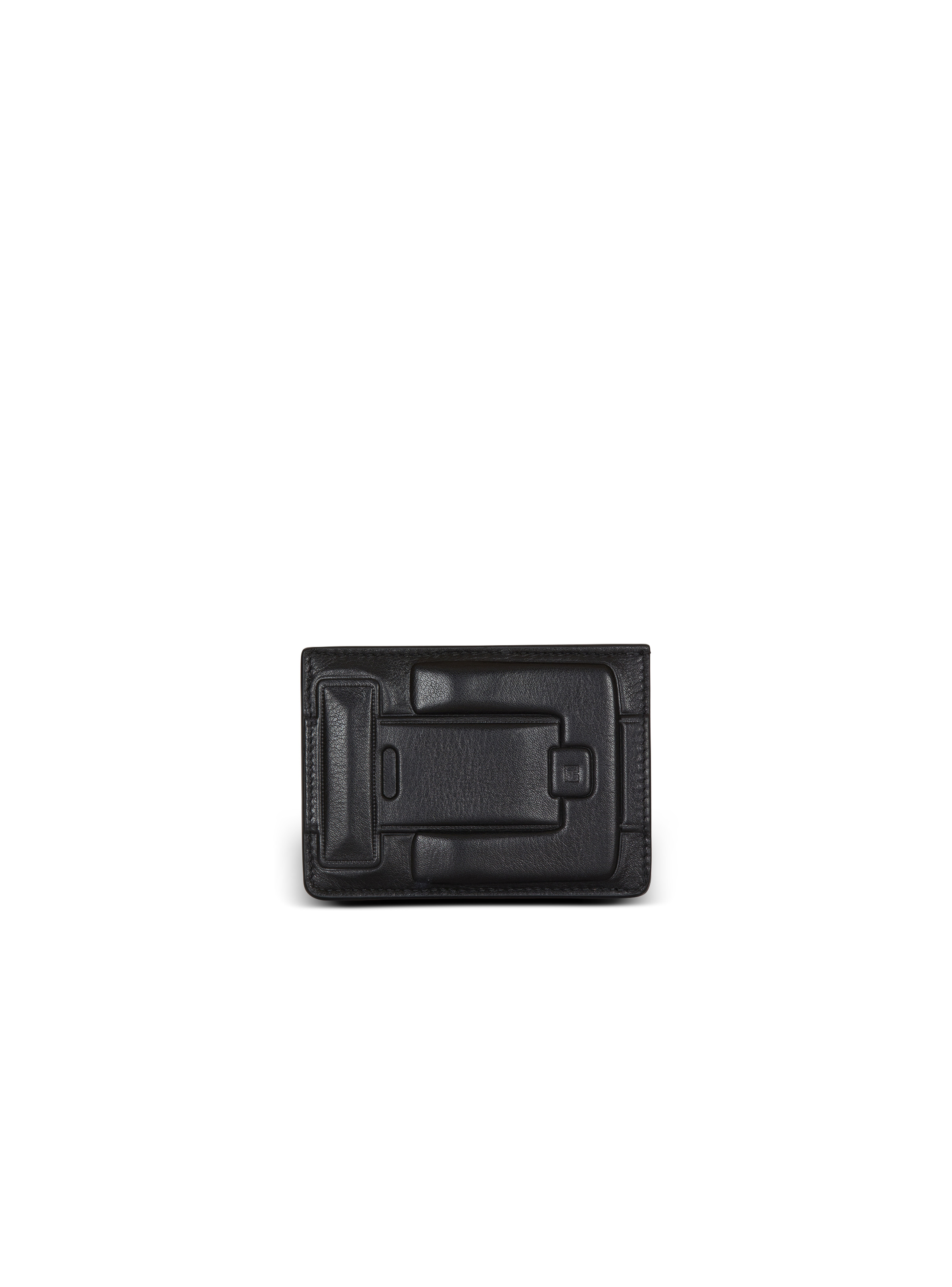 Anthem calfskin leather card holder - Grained leather Anthem buckle on the front - Embossed PB logo - 5 card slots - Golden embossed Balmain logo on the back - Dimensions: 11 x 8 cm - Main material: 100% calfskin - Made in Italy - Item: FN1MA260LVAA