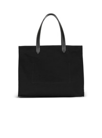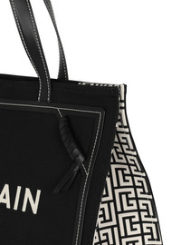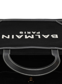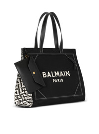 B-Army 42 canvas bag with leather details - Tote bag shape - Leather handles - Leather inserts and embroidered Balmain Paris logo - Balmain engraved lobster clasp at the top of the bag - Detachable pouch on the inside with a buttoned flap - Patch pocket and embossed label on the inside - Leather bag feet - Golden hardware - Comes with a protective cover - Dimensions: 42 x 34 x 13 cm - Main material: 100% cotton, calfskin - Made in Italy - Item: DN1FF810TPAC
