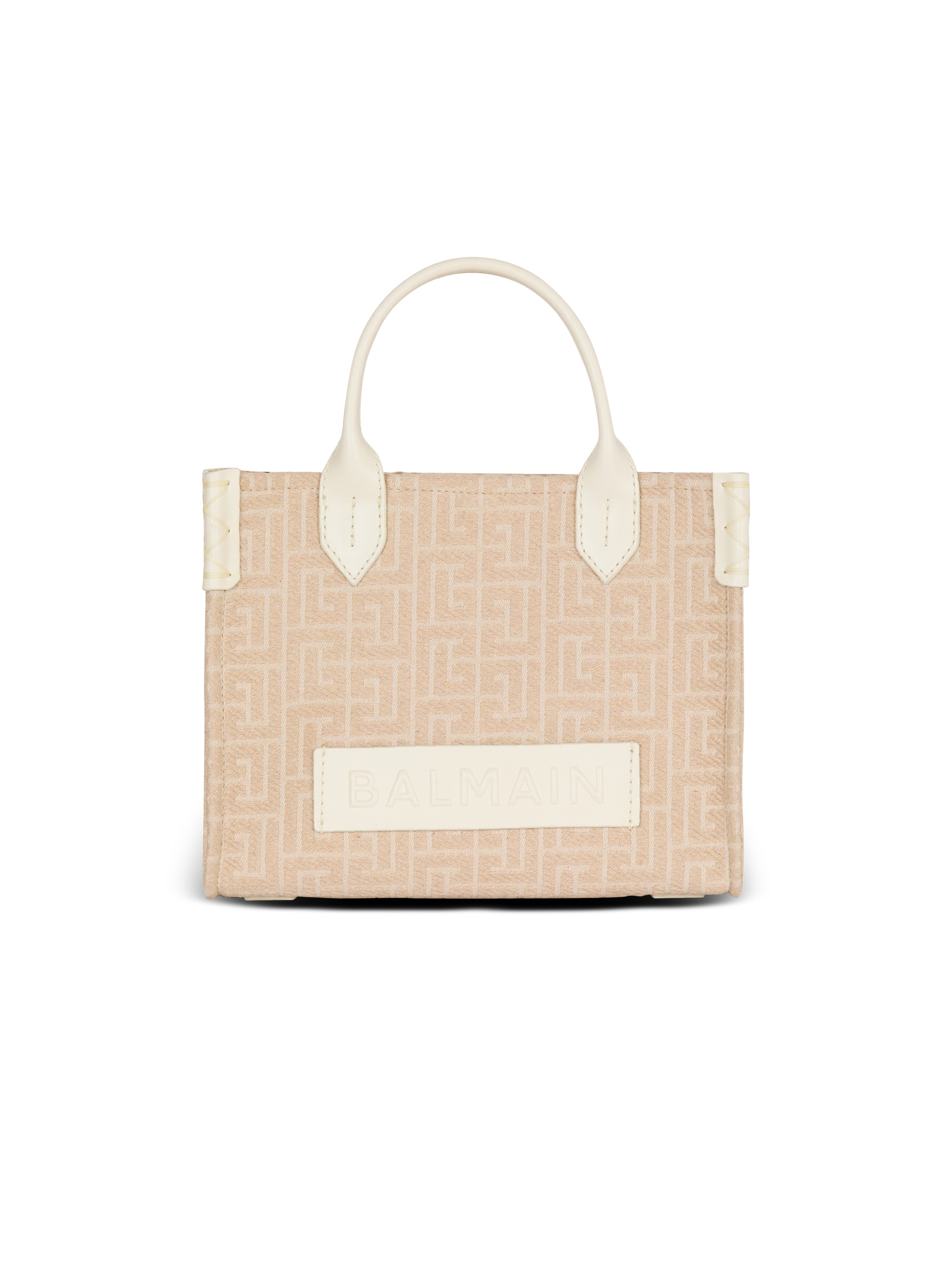 B-Army Small PB-monogrammed jacquard canvas and calfskin leather tote bag - Carry in the hand, on the shoulder or across the body - Balmain logo in debossed leather - Leather details and tone-on-tone stitching - Leather handles - Adjustable leather shoulder strap with stud buttons - Snap hook closure - Canvas inside pocket with embossed Balmain logo - Reinforced bottom - Leather bag feet - Gold hardware - Dimensions: 8.5 x 26 x 20.5 cm - Shoulder strap: 90 cm - Main material: 87% cotton 13% linen - Made in Italy - Item: FN1FE818TJSQ