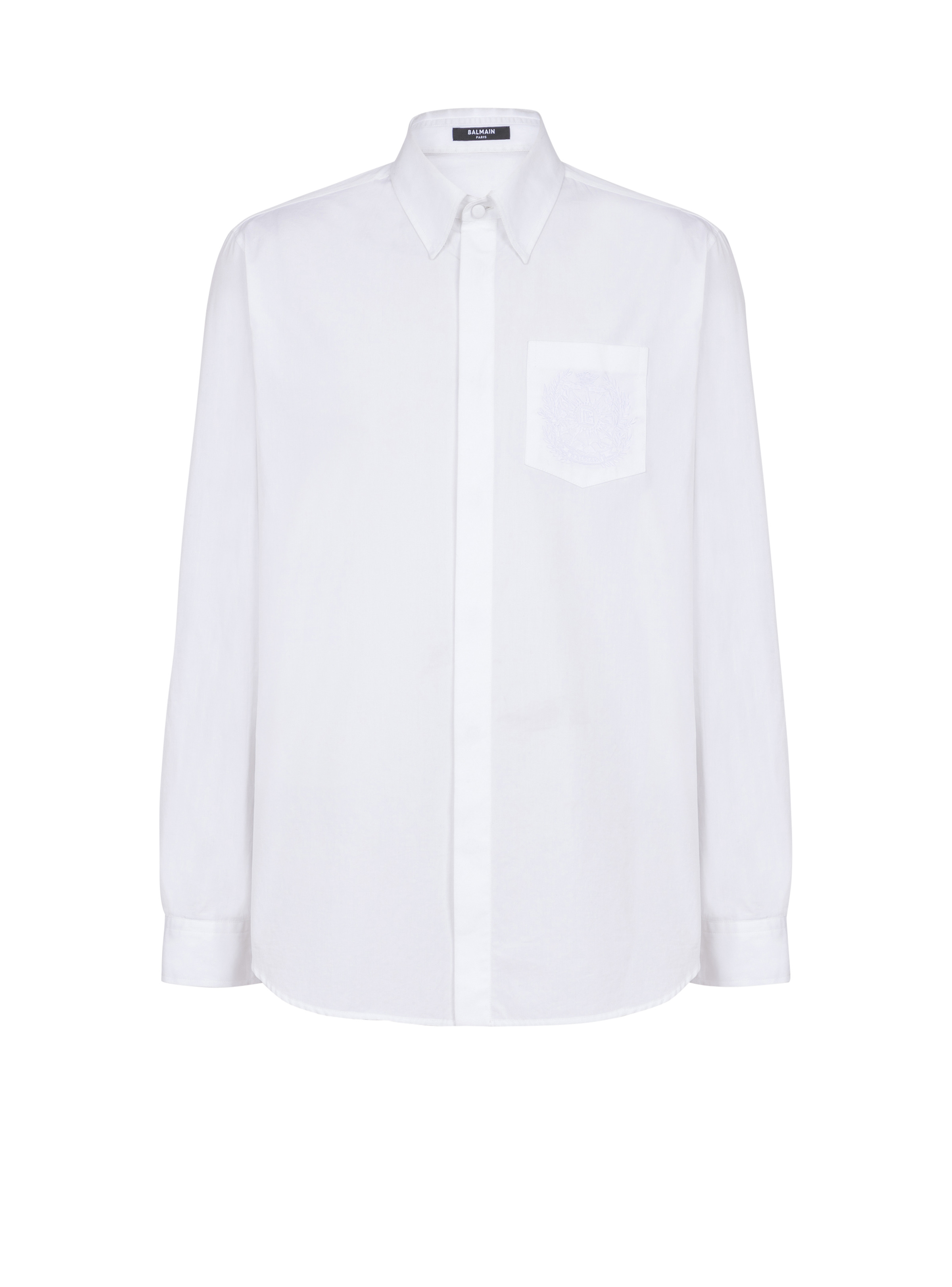 Balmain Ecusson embroidered cotton poplin shirt - Shirt collar - Long sleeves - Straight cuffs with 2 buttons - 1 patch pocket on the chest - Tone-on-tone Balmain Ecusson embroidery on the chest - Fastening with 7 buttons (6 under the placket) - Rounded hem - Straight cut - Model measures 190cm and wears a size 39 - Main material: 100% cotton - Made in Italy - Item: FH1HS480CE48