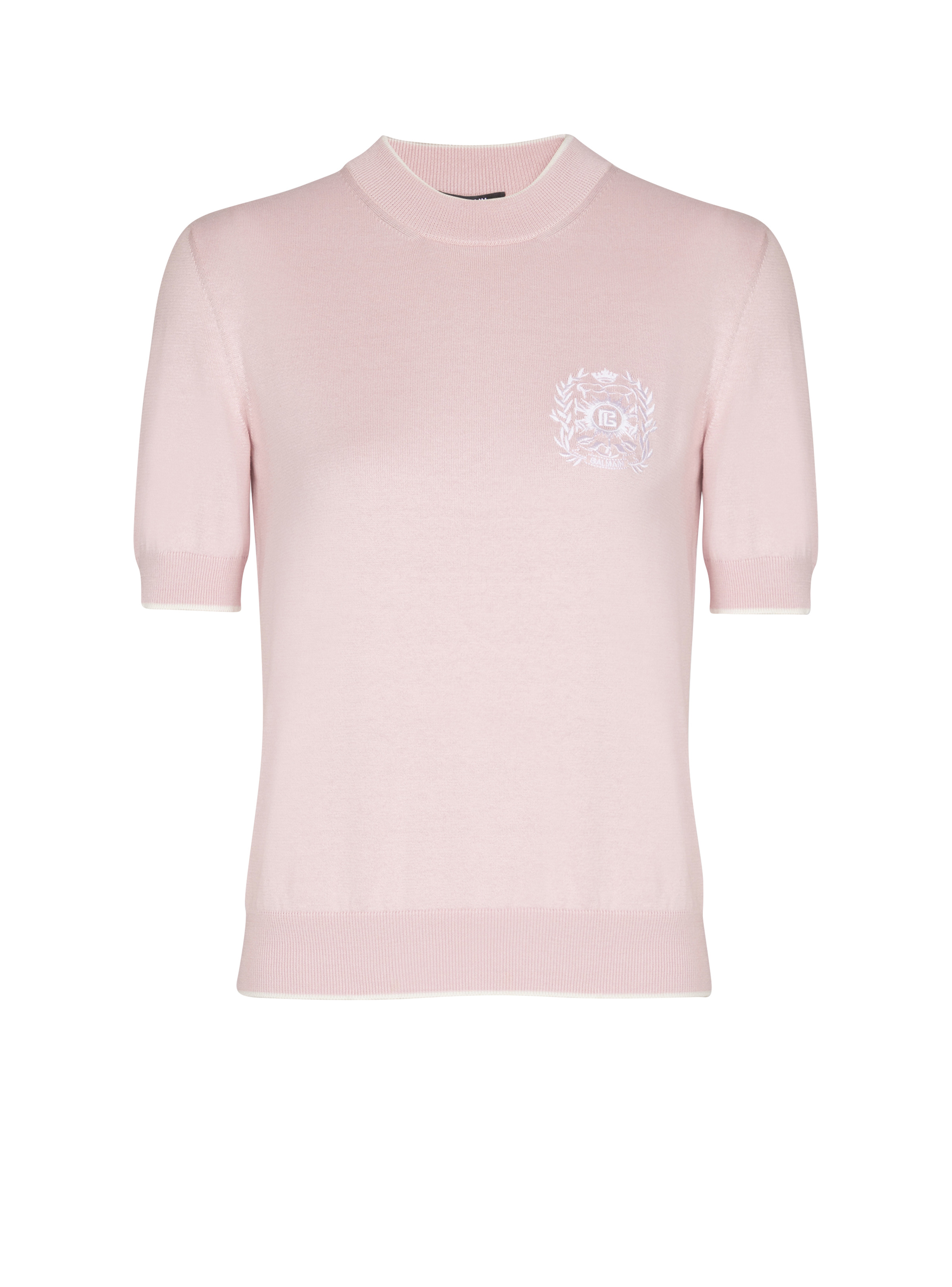 Balmain Embleme-embroidered knit top - Round neckline - Short sleeves - Ribbed trim with contrasting piping - Contrasting Balmain Embleme embroidered on the chest - Fitted cut - Model measures 179cm and wears a size 36 - Main material: 55% silk 45% cotton - Made in Italy - Item: FF1KA115KI86