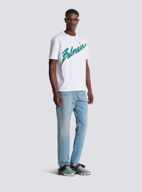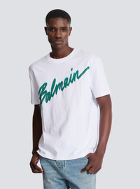 Balmain Lettre flocked T-shirt - Round neck with ribbed trim - Short sleeves - Contrasting printed flocked Balmain Lettre logo on the front - Regular fit - Model measures 190cm and wears a size M - Main material: 100% cotton - Made in Portugal - Item: FH1EG000BC86100% of the cotton fibres used to make this garment are certified and organically farmed