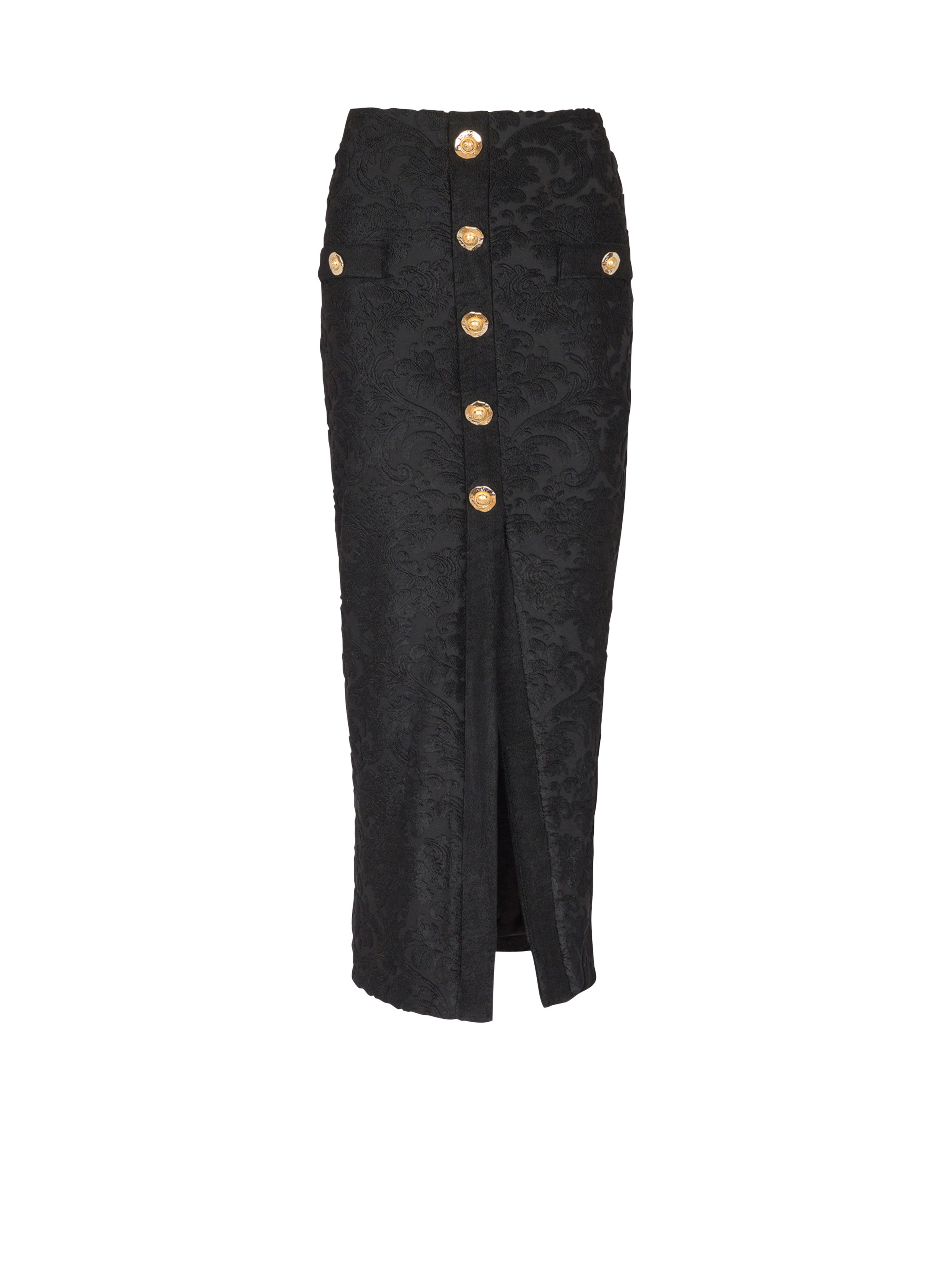 Boucle baroque pattern skirt - 5 decorative buttons on the front - 2 trompe-l'œil pockets with 2 decorative buttons - “Gold and Gold Coin” buttons - Front split - Visible gold metal zip fastening on the back with Balmain Paris-engraved slider - Jersey lining - Tight midi fit - Model measures 178cm and wears a size 36 - Main material: 65% viscose 35% polyester - Made in Bulgaria - Item: FF1LE481JK65
