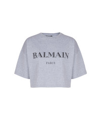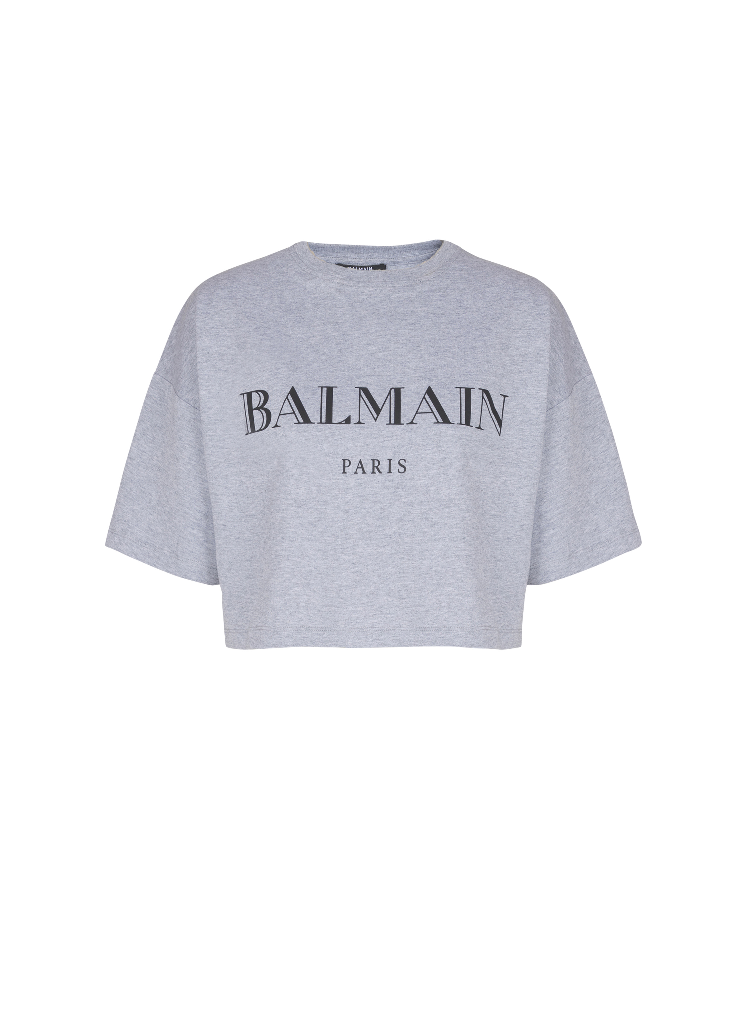 Boxy cropped T-shirt with Balmain print - Cropped, relaxed fit - Round neck with ribbed trim - Short sleeves - Vintage Balmain logo printed on the front - Model measures 178cm and wears a size S - Main material: 100% cotton - Made in Portugal - Item: FF2EE145BD33