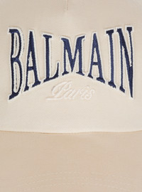 Cotton Balmain College cap - Contrasting Balmain Paris embroidery on the front - Adjustable back strap with engraved silver rectangular metal buckle - Topstitching - Relaxed vintage fit - Main material: 100% cotton - Made in Bulgaria - Item: FH0XA545CB24