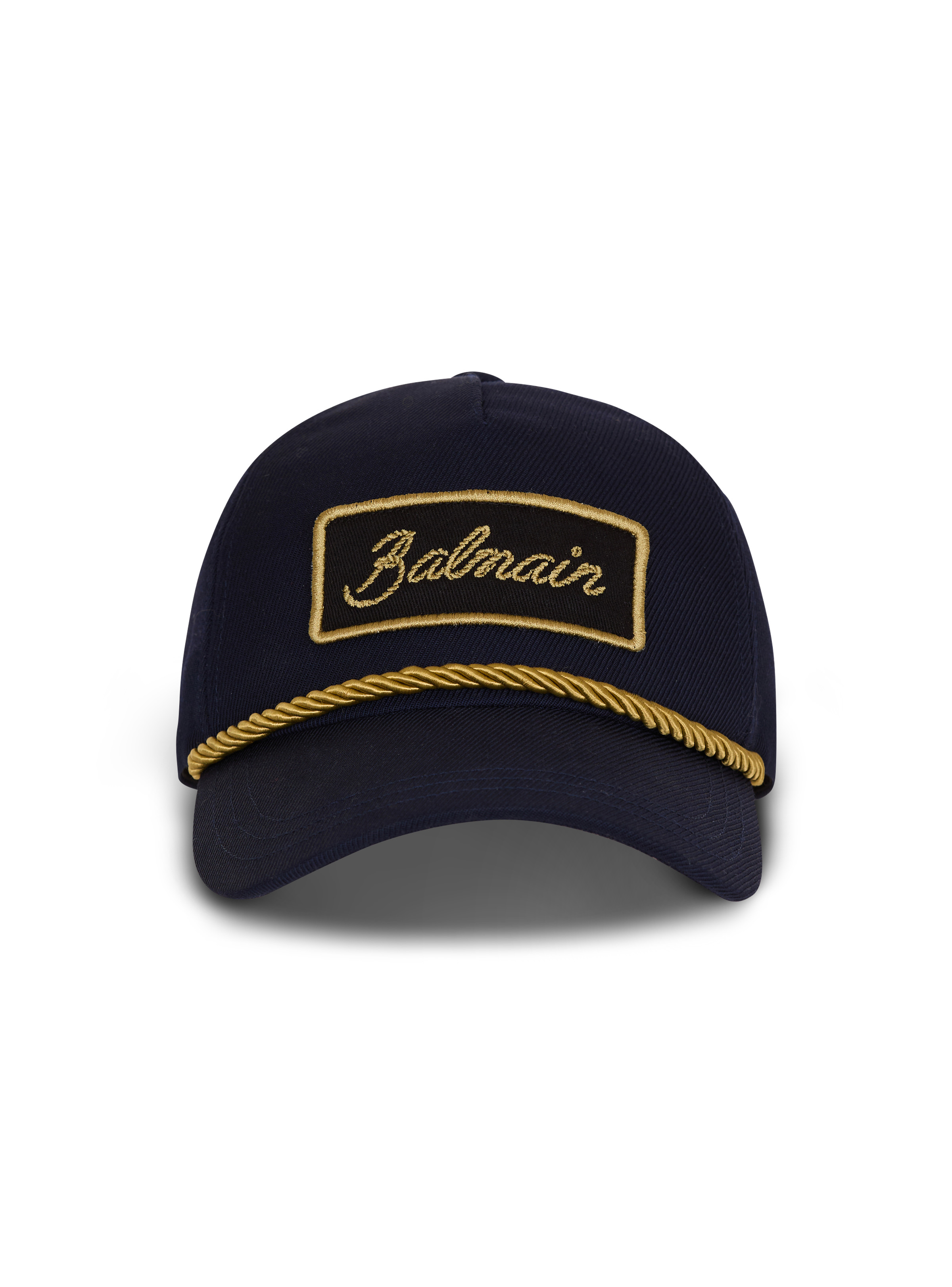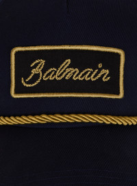 Cotton twill cap with twisted cord - Balmain Signature patch embroidered on the front - Embellished with twisted cord on the front - Curved visor - Adjustable Velcro tab - Cotton lining with Balmain Paris printed ribbons - Main material: 100% virgin wool - Made in Bulgaria - Item: FH1XA475WB02