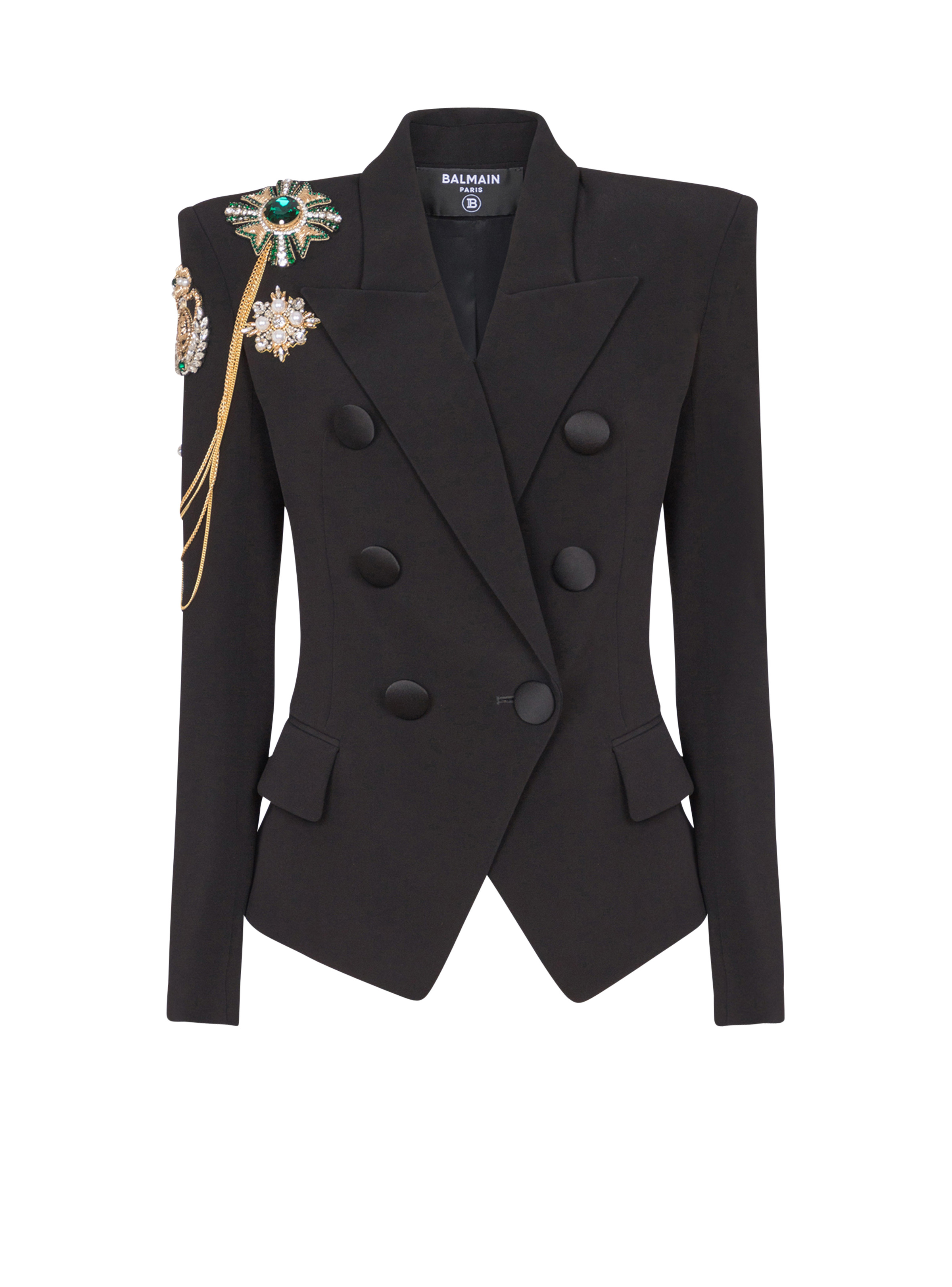 Crepe 6-button jacket with embroidered patches - Italian tailored collar - Structured shoulders - Embroidered patches on the shoulders and golden metal chains - Embroidery with beads, crystals and cannetille - Long sleeves - Straight cuffs with 5 buttons - Double-breasted fastening - 6 buttons on the front, 5 of which are decorative - Satin-covered buttons - 2 side slash pockets with flaps - Slash inside pocket with button - Crepe lining - Tailored fit, defined waist - Model measures 178cm and wears a size 36 - Main material: 100% viscose - Made in France - Item: FF1SI056PD19100% of the viscose fibres used to make this garment come from certified, sustainably managed forests