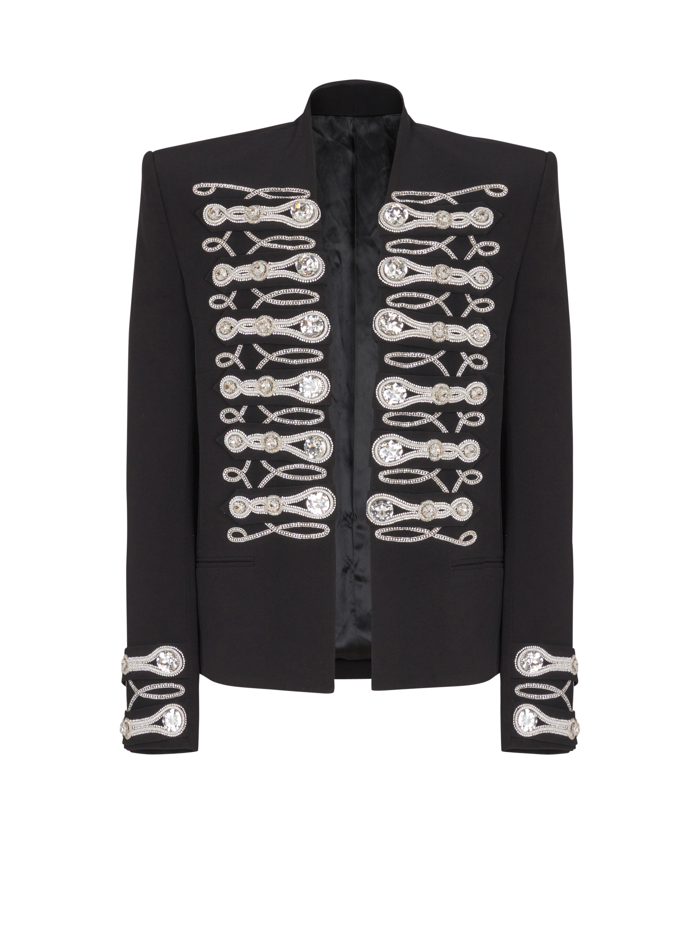 Crepe spencer jacket with embroidered frogging - Collarless - Structured shoulders - Long sleeves - Straight press-stud cuffs - Embroidered decorative tabs on the cuffs - Frogging-style embroidered decorative tabs on the front - Crystal, bead and cord embroidery - 2 slash side pockets - 2 slash inside pockets with buttons - Satin lining - Cropped slim fit - Model measures 190cm and wears a size 48 - Main material: 100% viscose - Made in India - Item: FH1SC485PD08100% of the viscose fibres used to make this garment come from certified, sustainably managed forests
