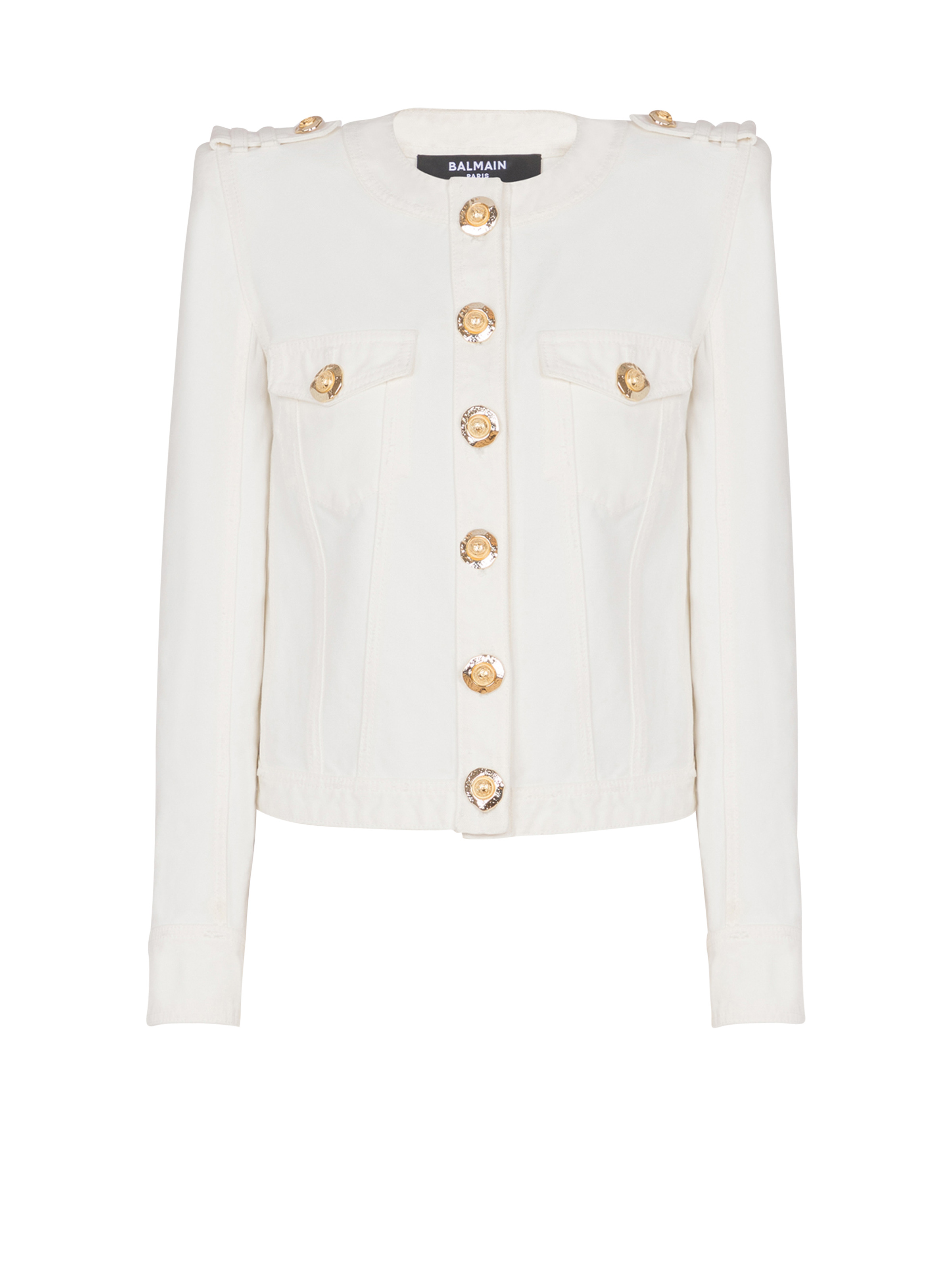 Plain cotton canvas jacket - Round neckline - Structured shoulders - Shoulder tabs with button and loop - Front fastening with 6 buttons - Long sleeves - Straight cuffs with 1 button - 2 buttoned flap pockets - Metal “Gold and Gold Coin” buttons - Worn-effect finish - Straight, cropped fit - Model measures 178cm and wears a size 36 - Main material: 100% cotton - Made in Italy - Item: FF1SK850DF78