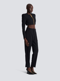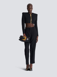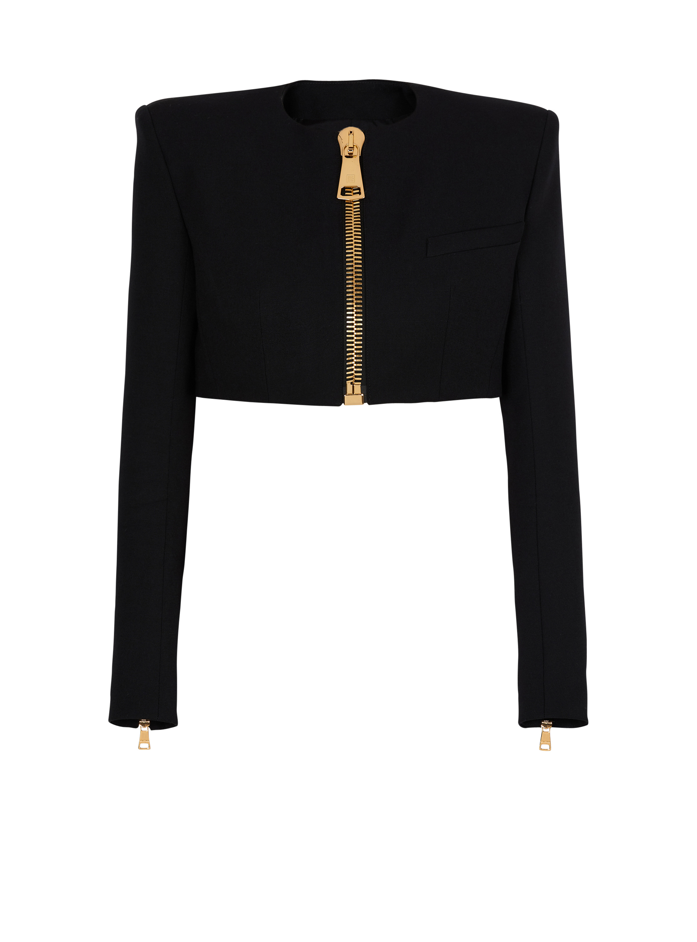 Cropped collarless jacket in grain de poudre wool - Built-in shoulder pads - Long sleeves ending in a large zip with a Balmain Paris-engraved slider - Welt chest pocket - Large zip with oversized PB-engraved slider - Tailored fit - Lined - Model measures 180cm and wears a size 36 - Main material: 100% sheep's wool - Made in Bulgaria - Item: FF0SD228WC09100% of the wool fibres used to make this garment are sourced from sheep farms that are certified and animal welfare-friendly