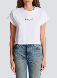 Cropped T-shirt with Balmain print - Cropped, relaxed fit - Round neck with ribbed trim - Short sleeves - Balmain logo printed on the front - Model measures 178cm and wears a size S - Main material: 100% cotton - Made in Portugal - Item: FF2EE005BD36
