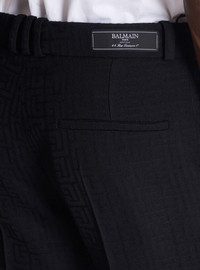 Darted grain de poudre trousers with monogram print - Italian side pockets - Waistband with belt loops - Embroidered Balmain Paris label on the back - Zip fly fastening with button and hook - Regular fit - Model measures 190cm and wears a size 48 - Main material: 100% virgin wool - Made in Portugal - Item: GH1PO120WD54