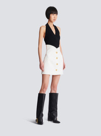 Double crepe tulip skirt with buttons - High waist with cut-outs - 2 slash side pockets - Decorative buttons on the front - “Bobine” two-tone metal buttons - Visible gold metal zip fastening on the back with Balmain Paris-engraved slider - Twill lining - Reinforced with boning - Cropped slim fit - Model measures 179cm and wears a size 36 - Main material: 97% viscose 3% elastane - Made in Bulgaria - Item: EF2LB027VE17100% of the viscose fibres used to make this garment come from certified, sustainably managed forests