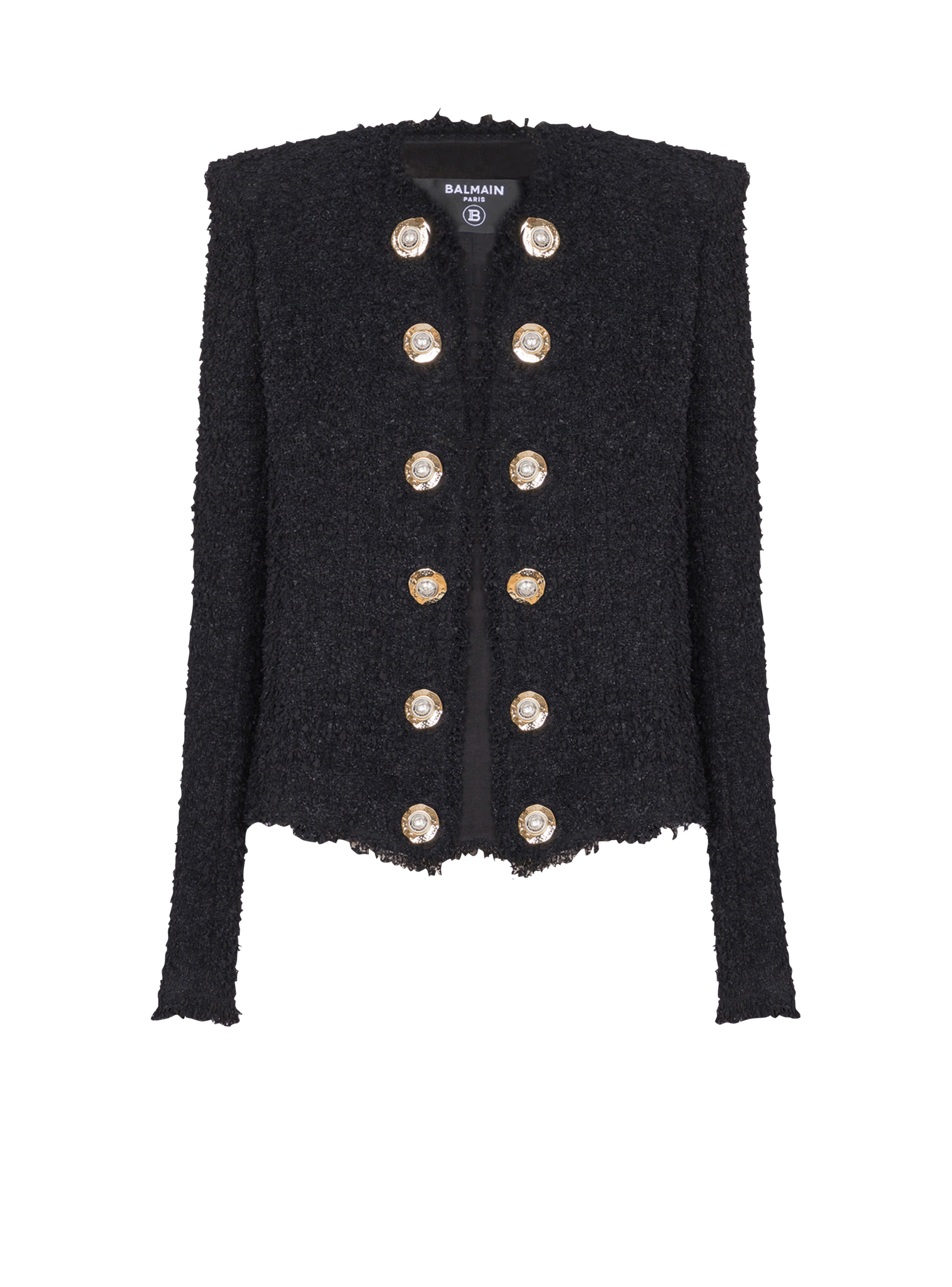 Edge-to-edge silky tweed jacket - Round neckline - Structured shoulders - Long sleeves - Straight cuffs with 5 golden metal ‘Coin’ buttons - 12 metal ‘Gold and Gold Coin’ decorative buttons on the front - Raw hems - Twill lining - Straight cut - Model measures 178cm and wears a size 36 - Main material: 100% polyamide - Made in Poland - Item: FF1SM508XC67